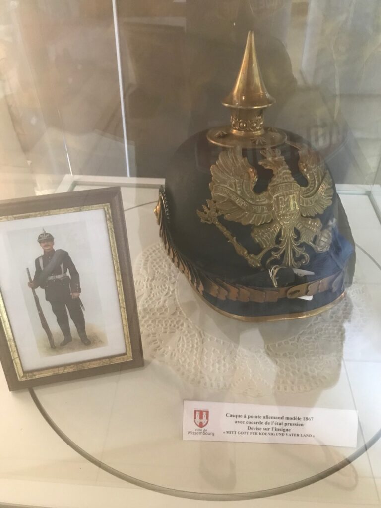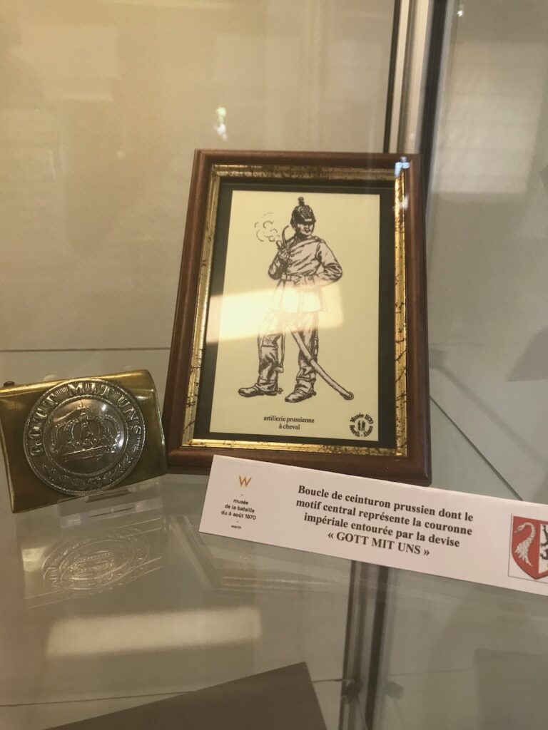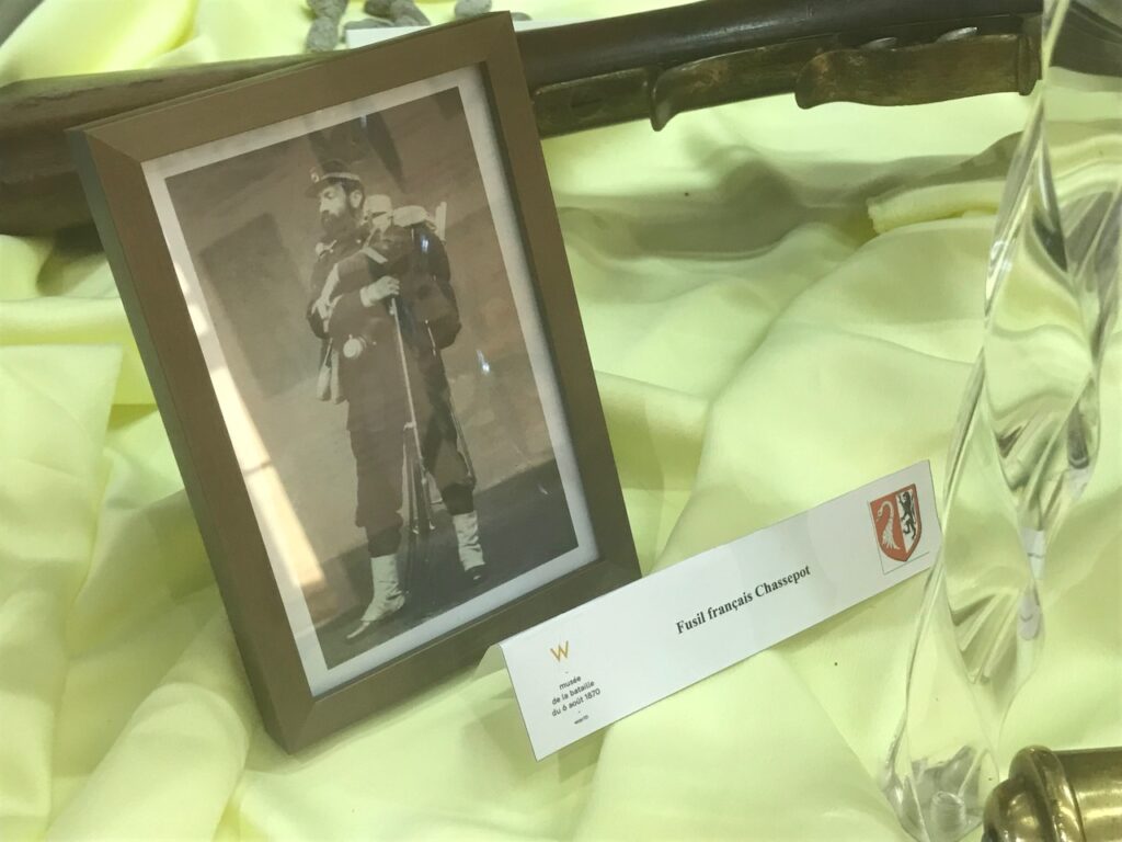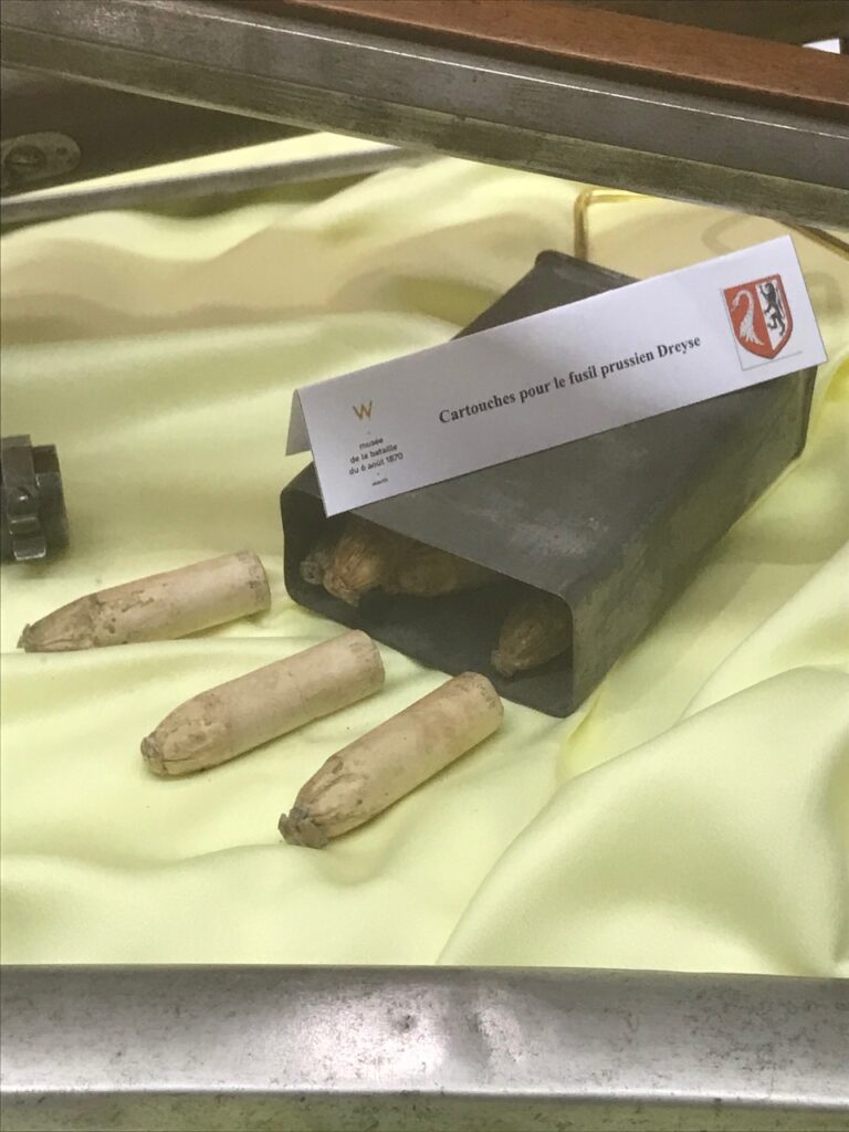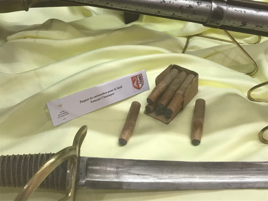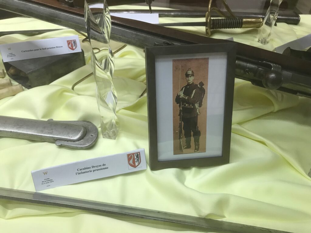 Duitse Pickelhaube.IJzeren kruis.Pruisische medailles.Pruisische riemgesp met opschrift: "Gott mit uns".Franse fusilleer met een Chassepot geweer.Patronen voor het Chassepot geweer.Pruisische infanterist met Dreyse geweer.Patronen voor het Dreyse geweer.Franse dragonder helm.