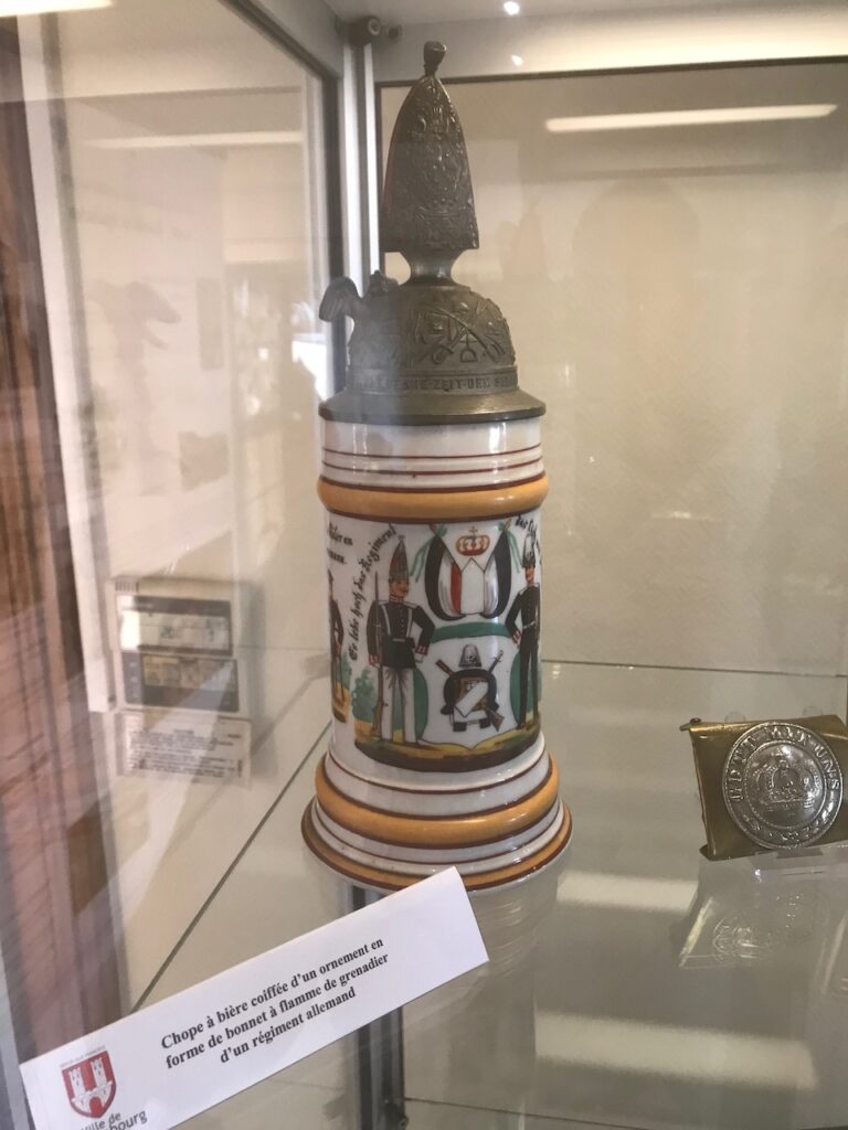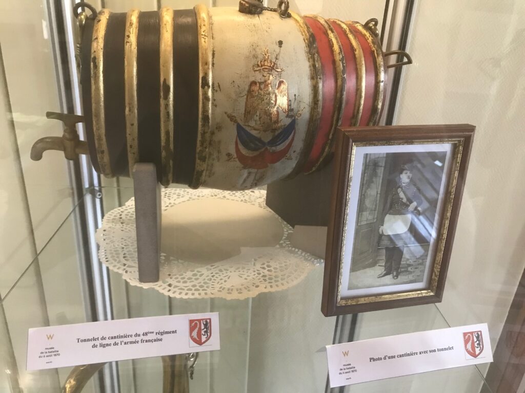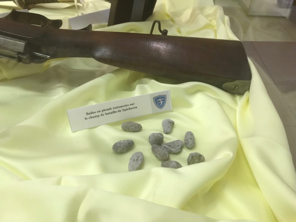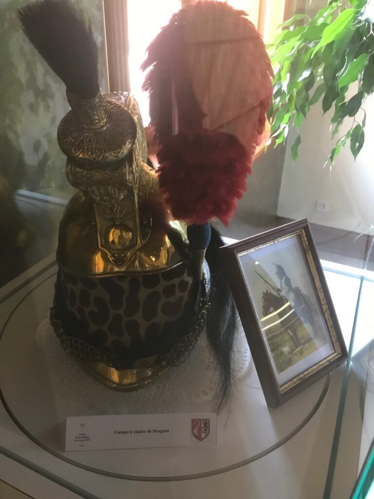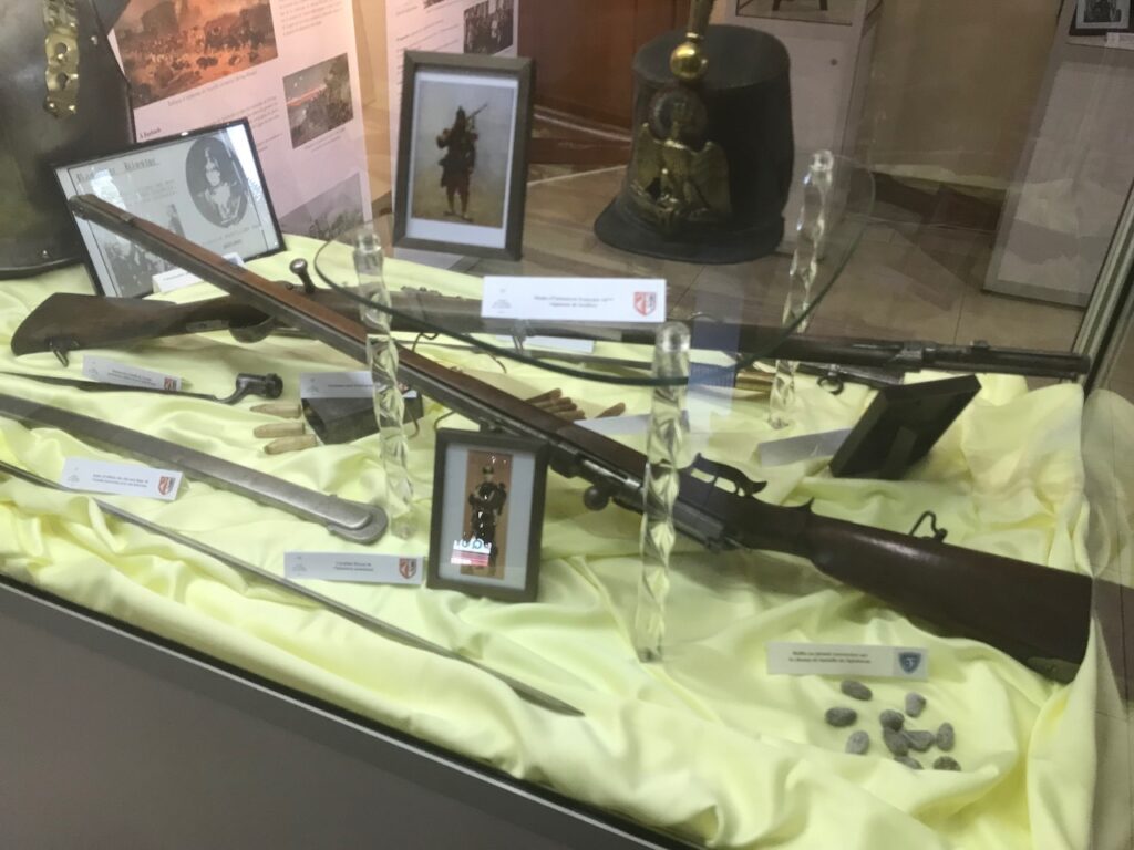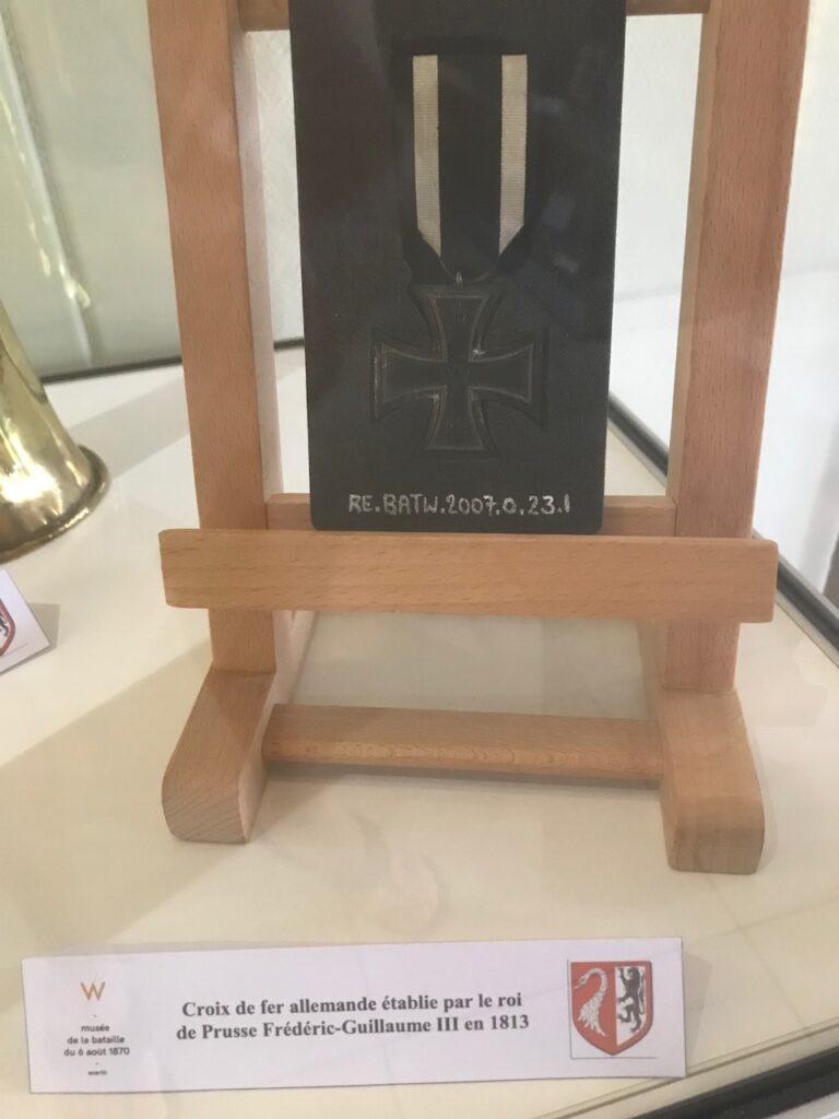 Duitse Pickelhaube.IJzeren kruis.Pruisische medailles.Pruisische riemgesp met opschrift: "Gott mit uns".Franse fusilleer met een Chassepot geweer.Patronen voor het Chassepot geweer.Pruisische infanterist met Dreyse geweer.Patronen voor het Dreyse geweer.Franse dragonder helm.