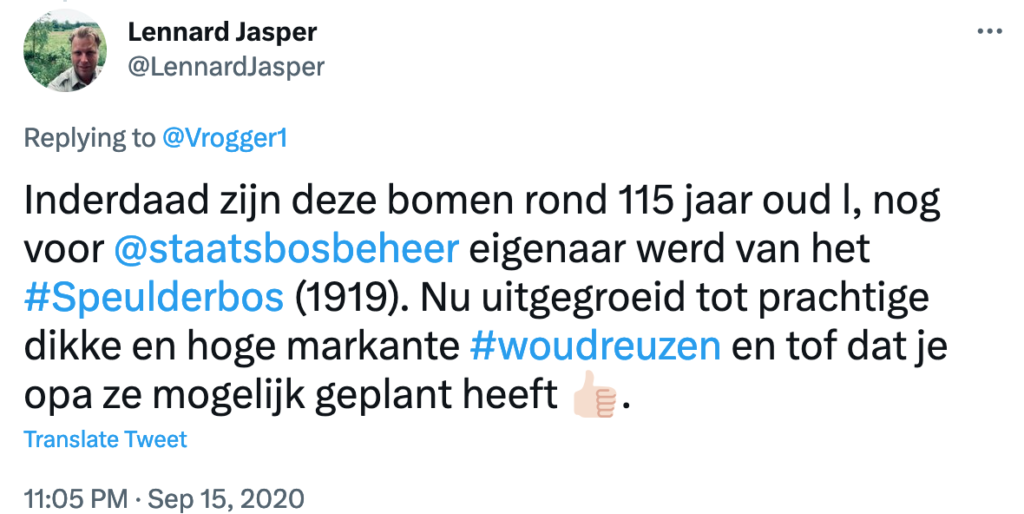 Langs de weg van Putten naar Drie (dichtbij Drie) staat een vak met enorme douglassen. Het verhaal gaat dat mijn opa (C. Kleijer) die als kind heeft helpen planten. Dan zouden die bomen nu wellicht tussen de 115 en 120 jaar oud zijn. Wat is jouw inschatting Lennard Jasper?