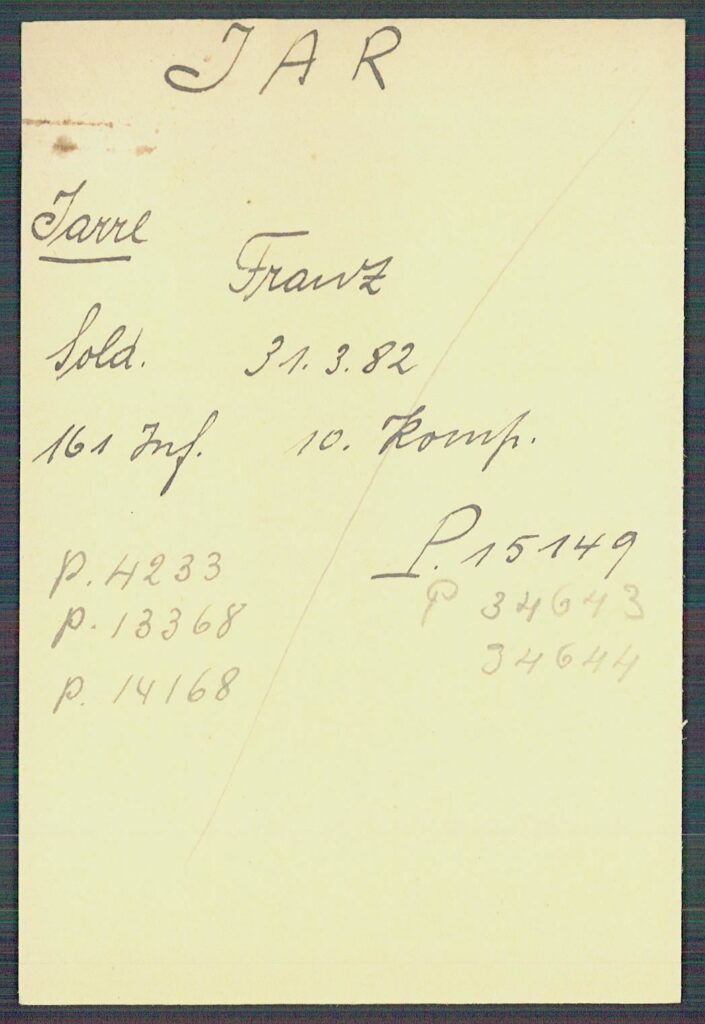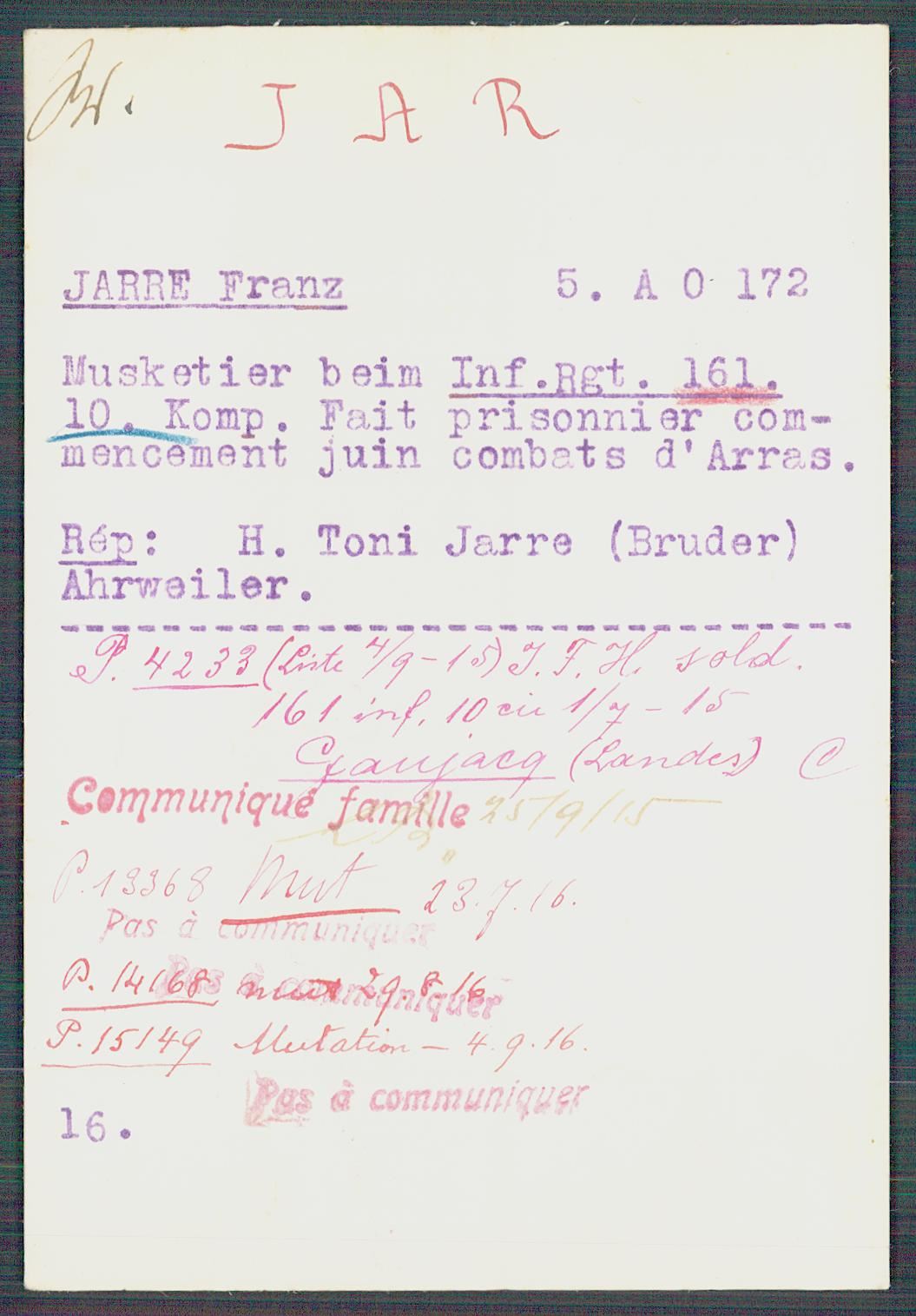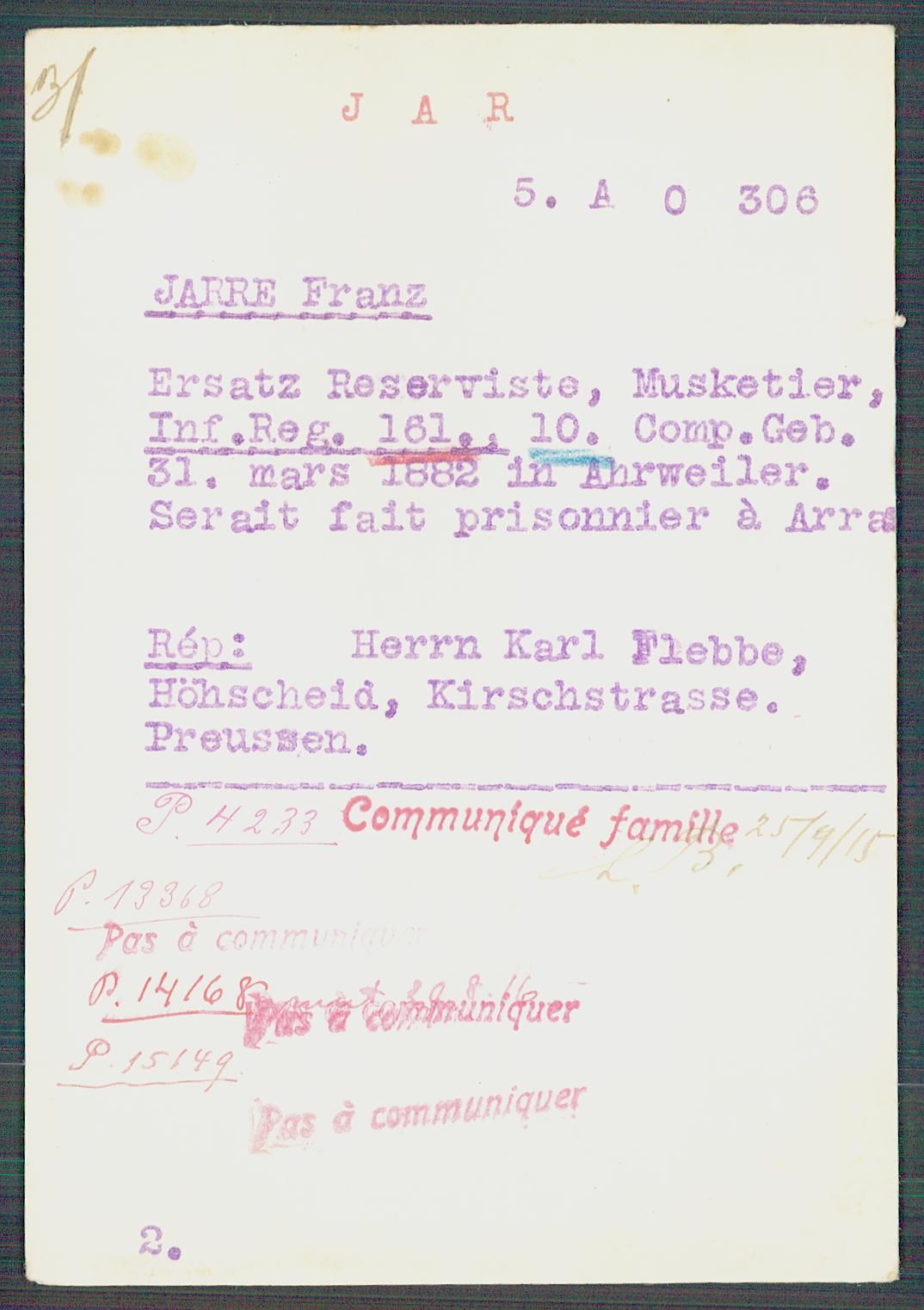 | Aantekeningen | 03-07-1915 Melding vermist in Deutsche Verlustlisten, Preußen 265. 20-01-1916 Melding gevangen in Deutsche Verlustlisten, Preußen 434. |