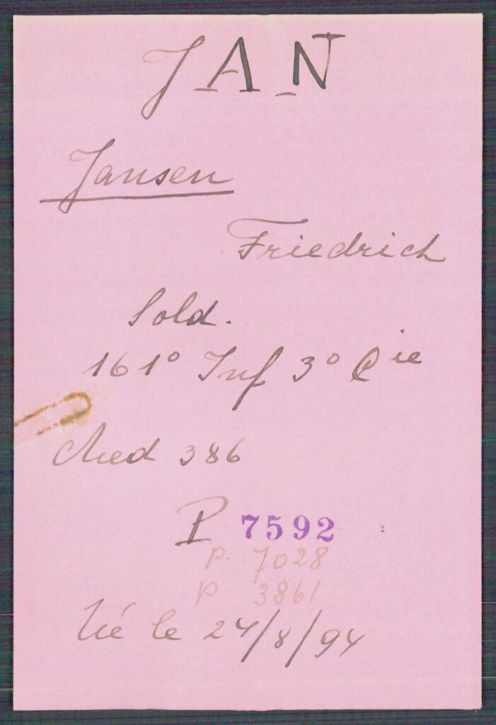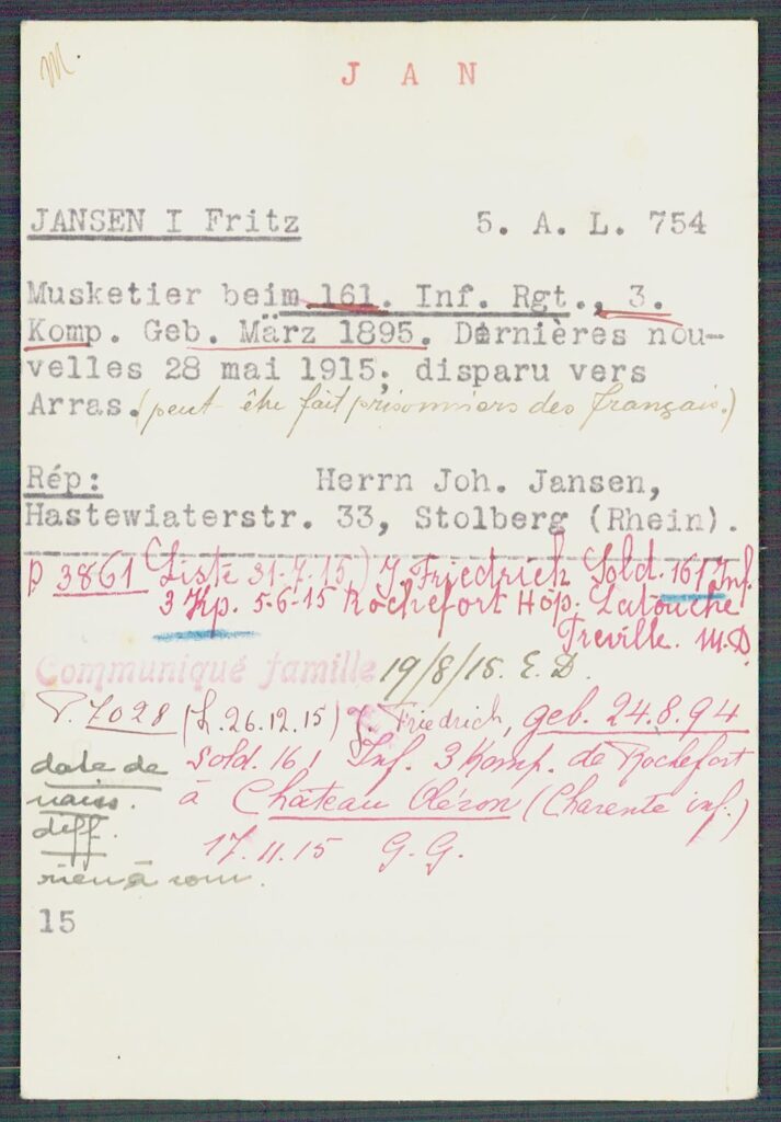 | Aantekeningen | 26-06-1915 Melding vermist in Deutsche Verlustlisten, Preußen 259. 21-01-1916 Melding gevangen in Deutsche Verlustlisten, Preußen 435. |