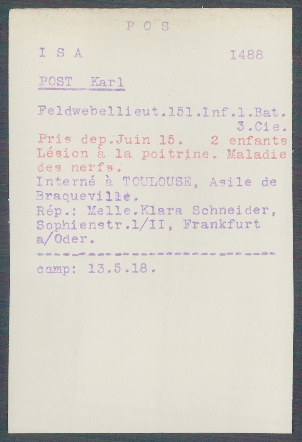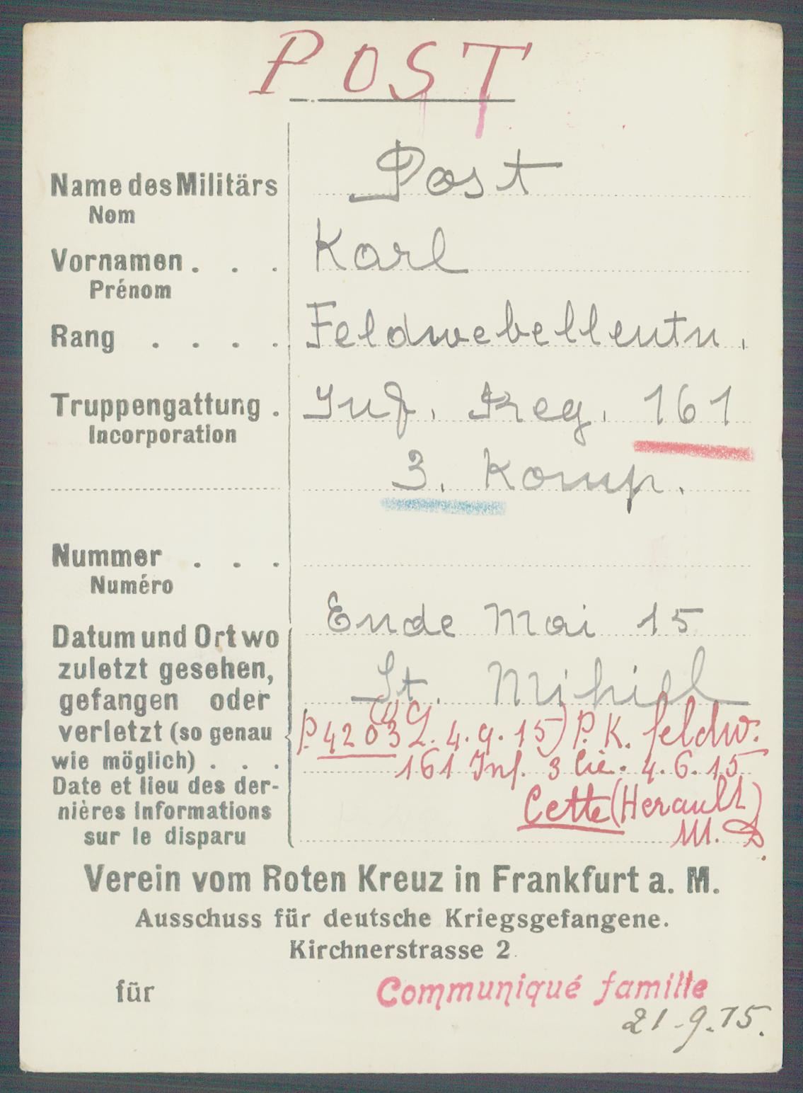| Aantekeningen | 03-02-1919 Melding teruggekeerd "war i. Gefgsch. Cetia, jetzt Festgslaz. XX Cöln" in Deutsche Verlustlisten, Preußen 1355. |