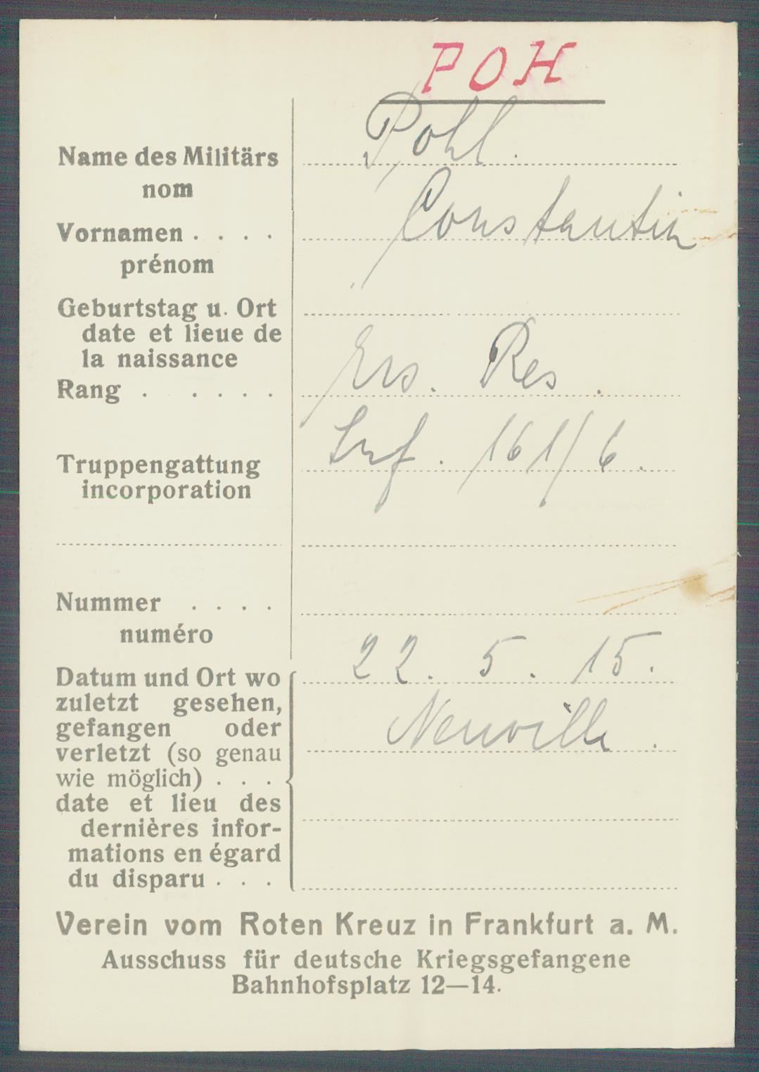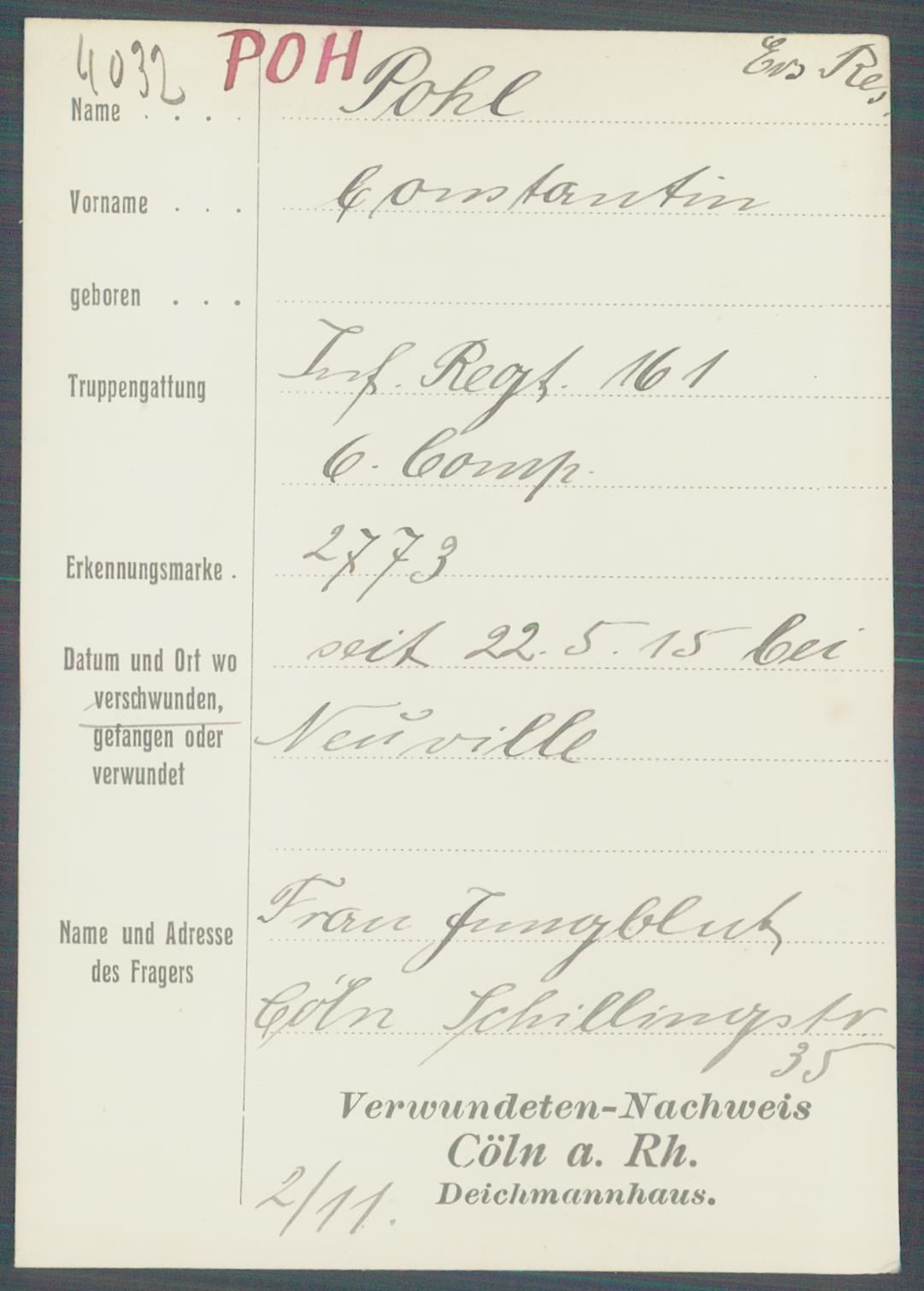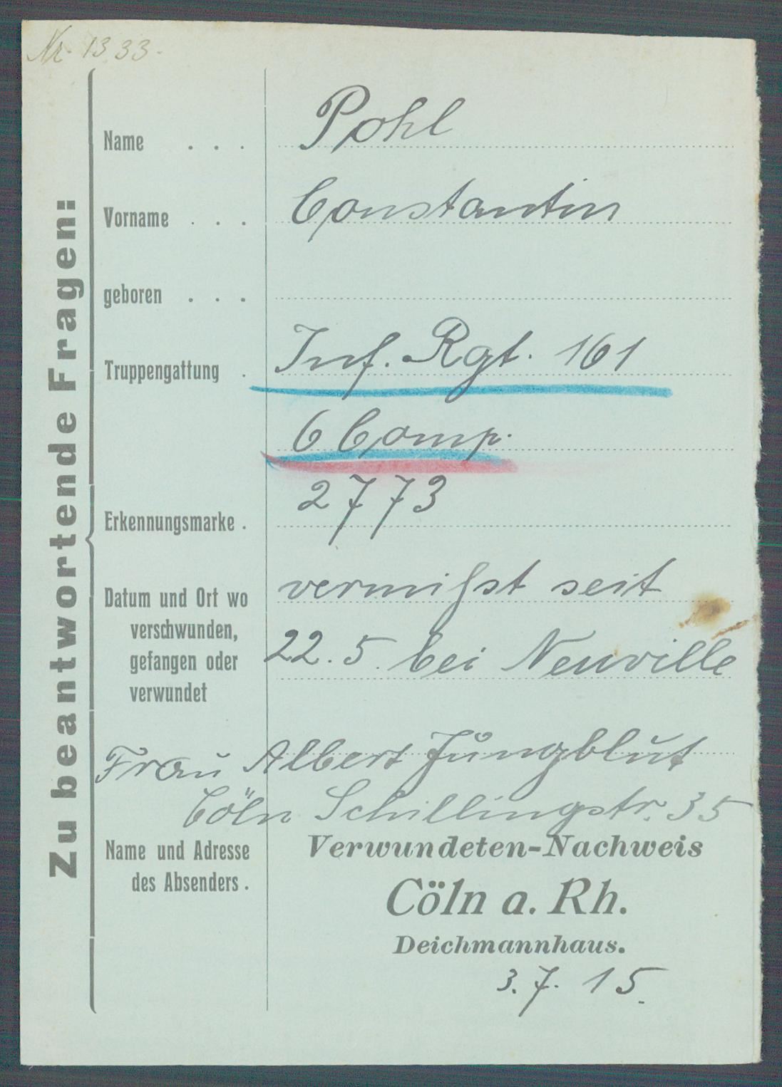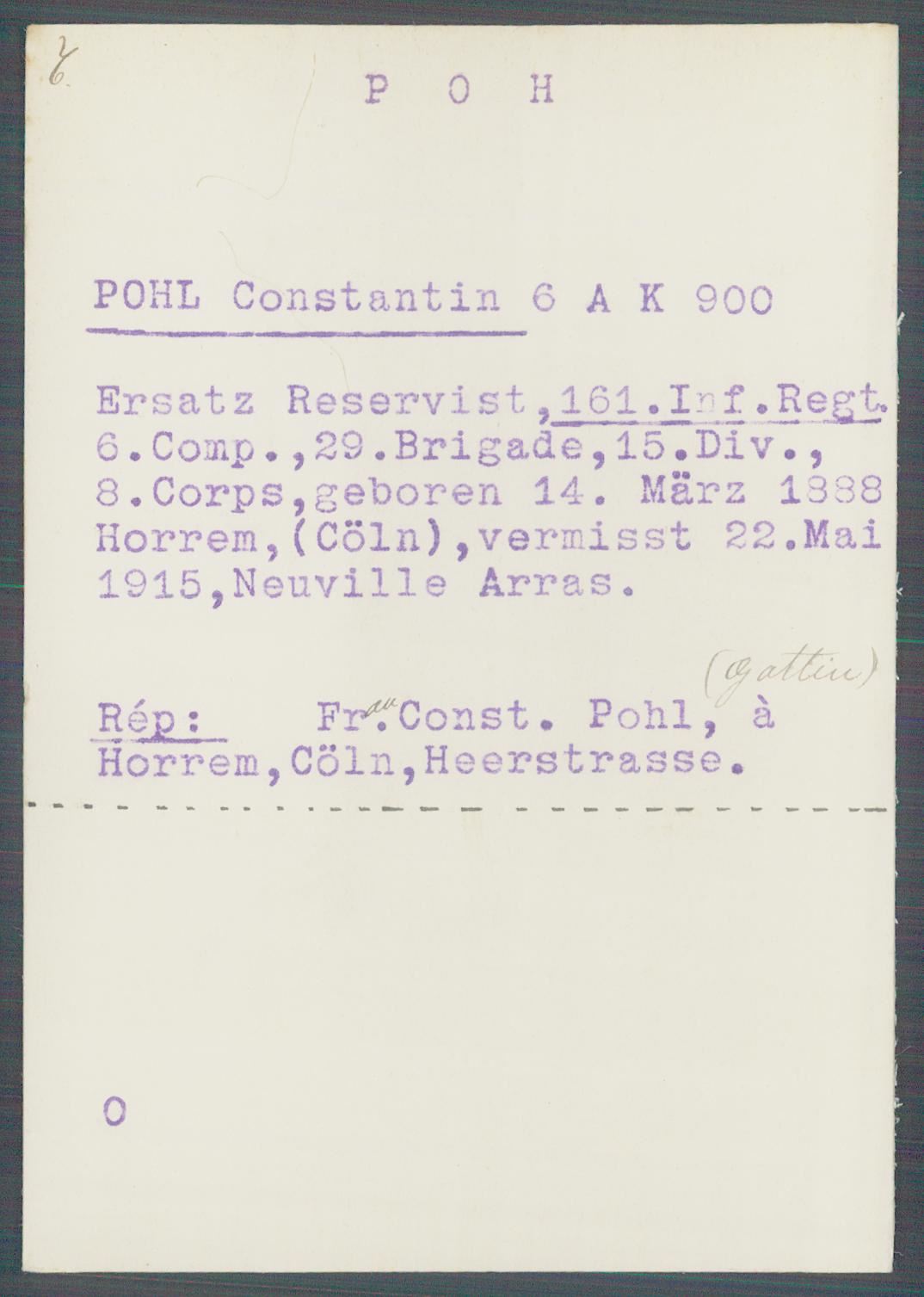 | Aantekeningen | 21-06-1915 Melding vermist in Deutsche Verlustlisten, Preußen 254. |