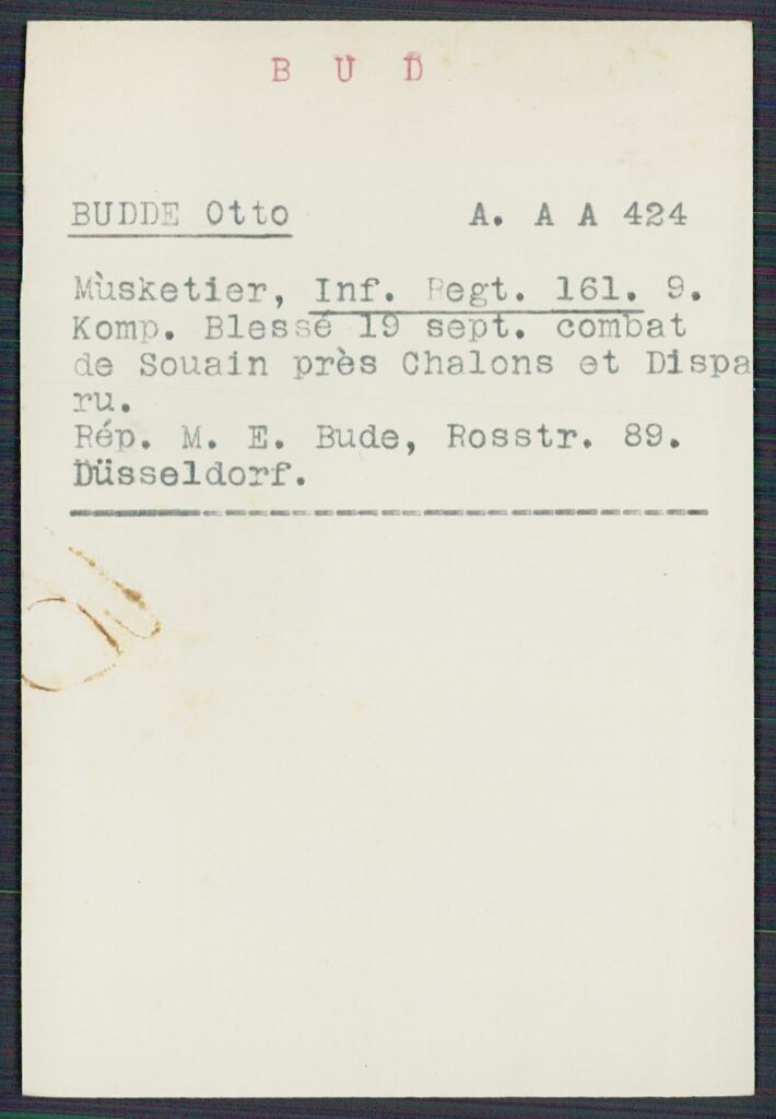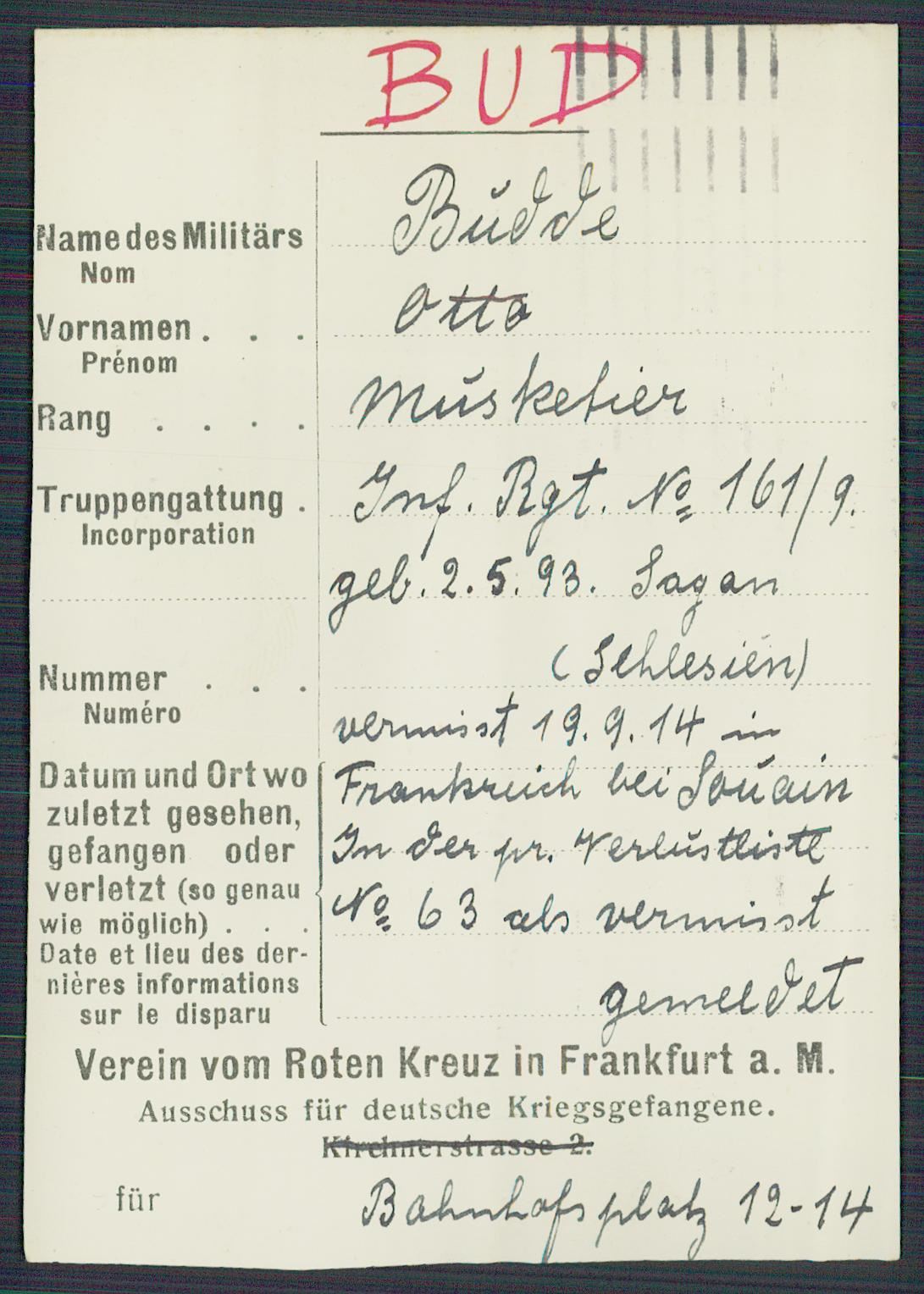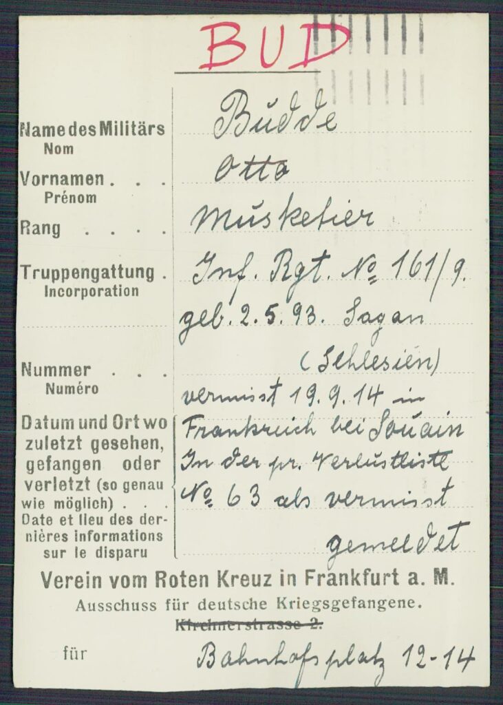 | Aantekeningen | 29-10-1914 Melding vermist in Deutsche Verlustlisten, Preußen 63. |