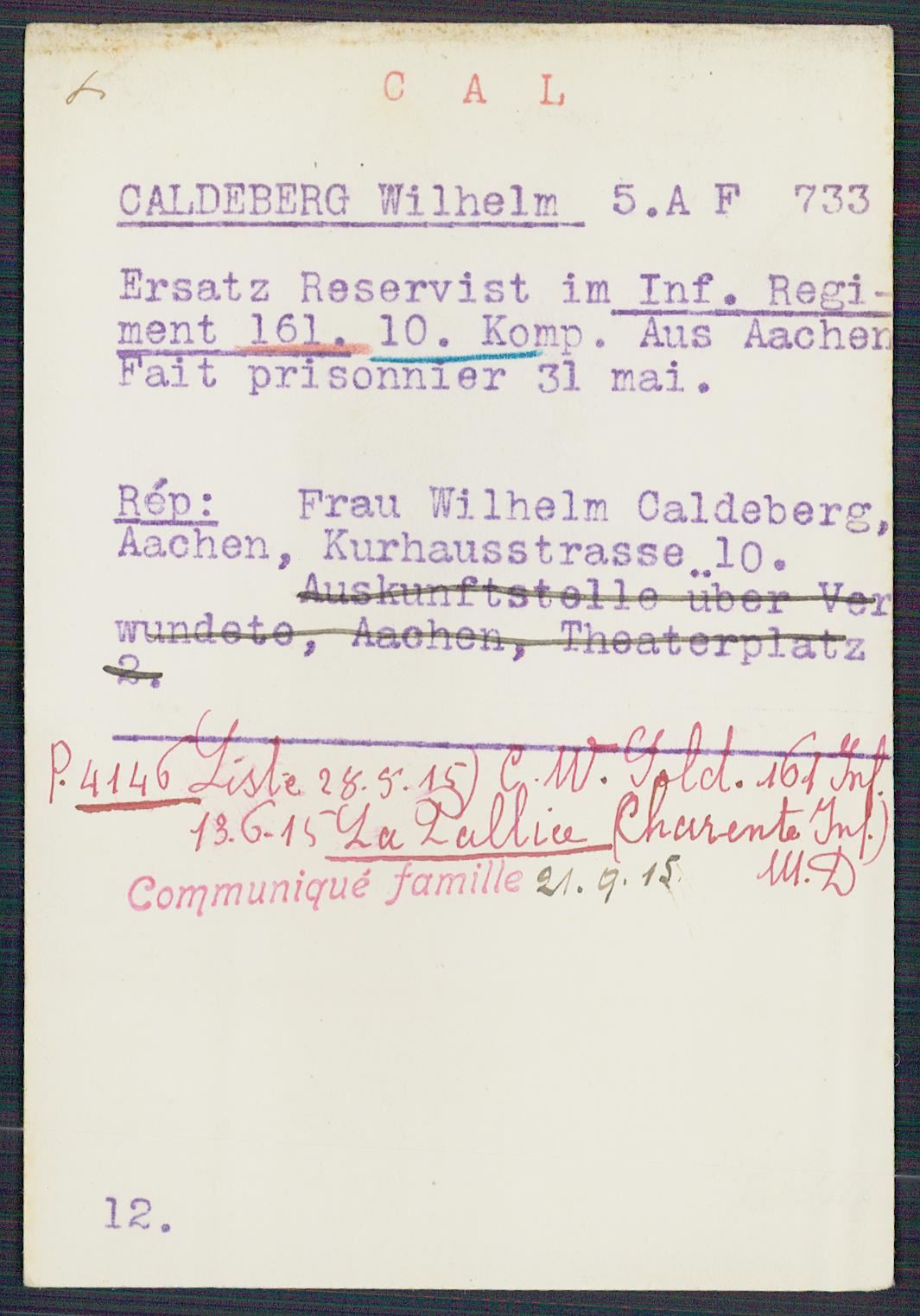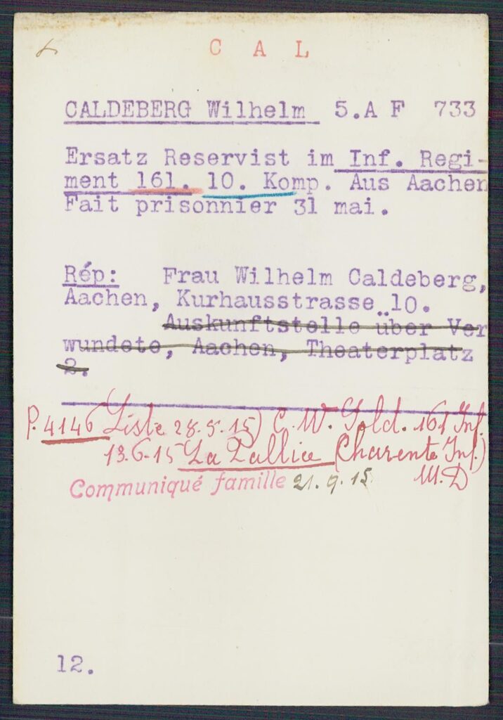 | Aantekeningen | 03-07-1915 Melding vermist in Deutsche Verlustlisten, Preußen 265. 20-01-1916 Melding gevangen in Deutsche Verlustlisten, Preußen 434. |