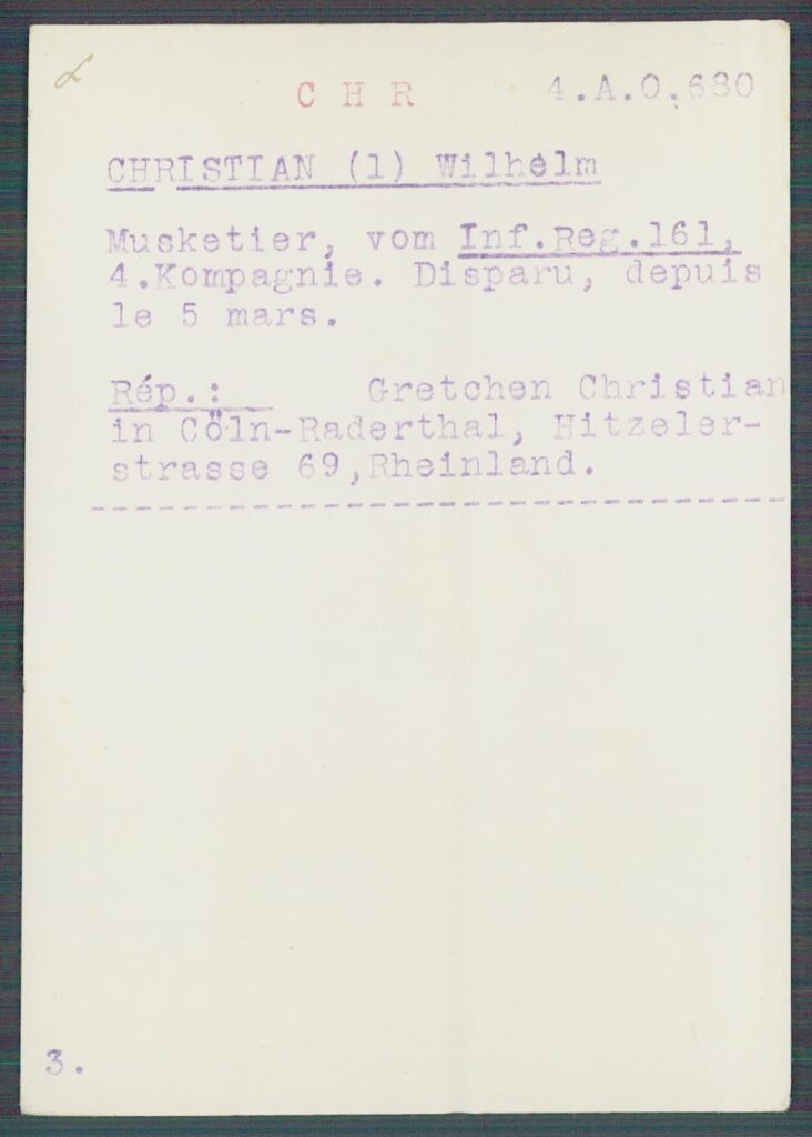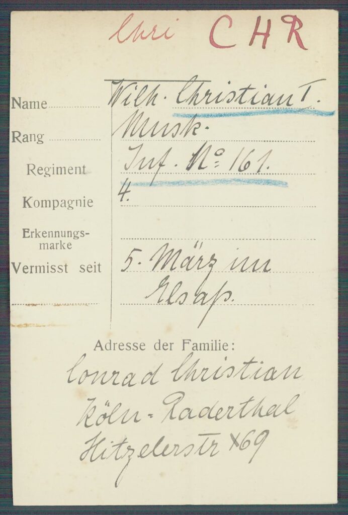 | Aantekeningen | 27-03-1915 Melding vermist in Deutsche Verlustlisten, Preußen 185. |