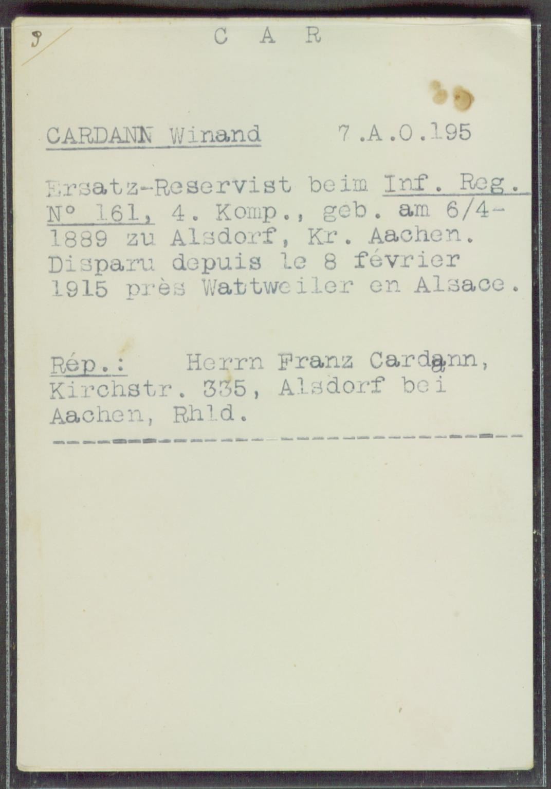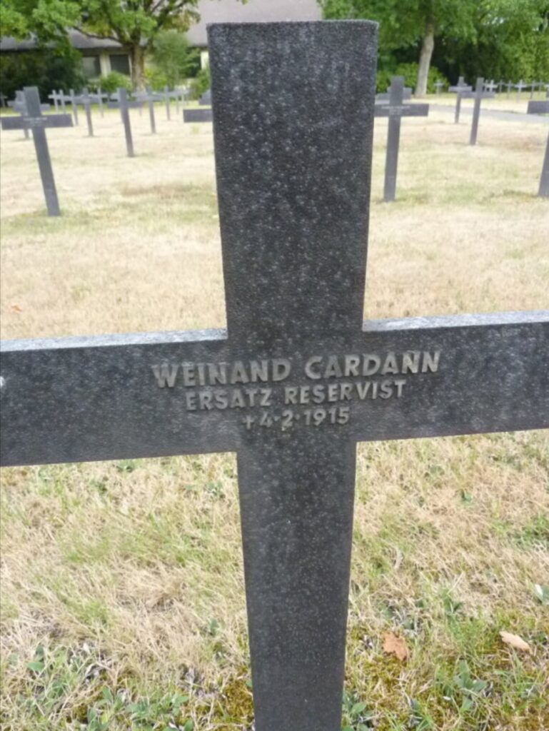 | Aantekeningen | 20-02-1915 Melding "Winand Cardann" overleden in Deutsche Verlustlisten, Preußen 155. 18-06-1919 Melding "Cardaun [nicht Cardann], Winand" overleden in Deutsche Verlustlisten, Preußen 1464. Op de grafsteen staat de naam "Weinand Cardann". In het Rode Kruis dossier staat de naam "Cardann Winand". |