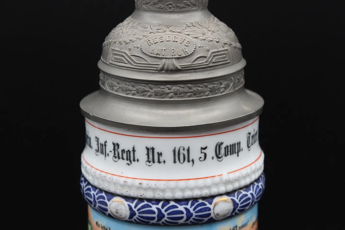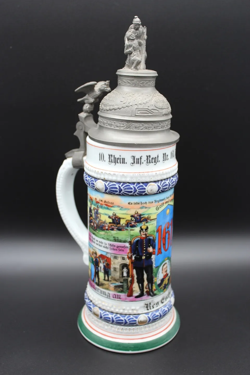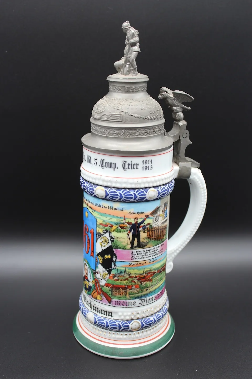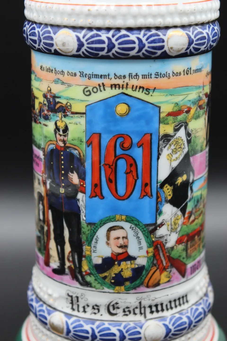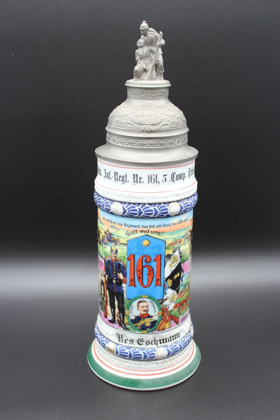 Op 12 juni 2022 kocht ik een Reservistenkrug van reservist Gerhard Eschmann van het Infanterie-Regiment Nr. 161. Hij diende als Unteroffizier der Reserve bij de 5e compagnie tijdens de Eerste Wereldoorlog. Hij kwam om het leven tijdens gevechten in mei 1915, vermoedelijk bij Arras in Frankrijk.